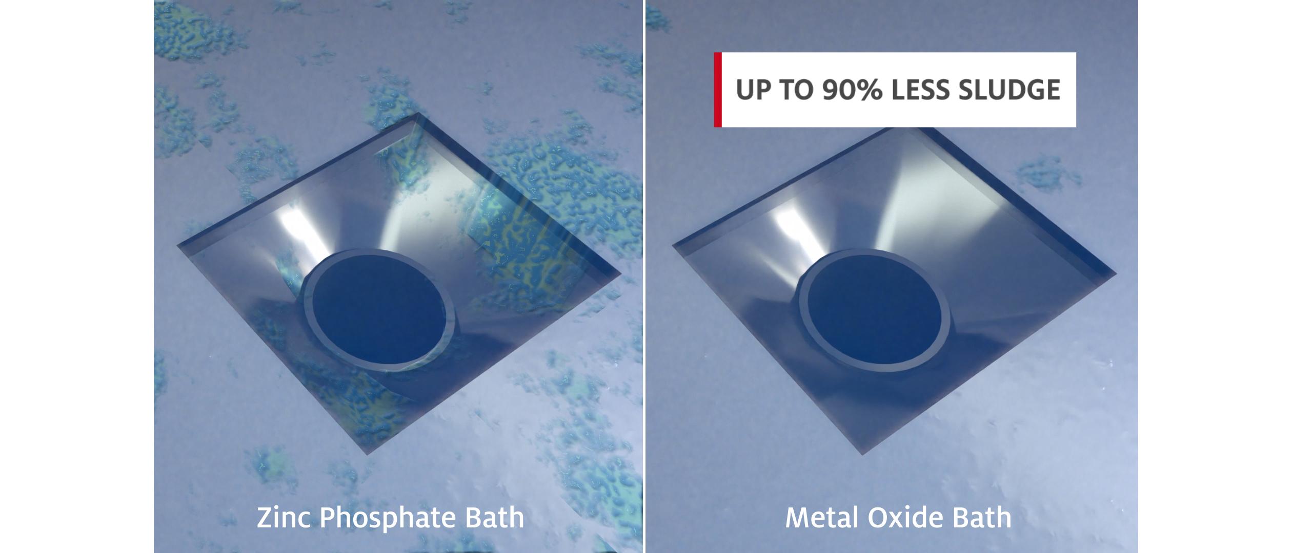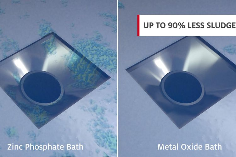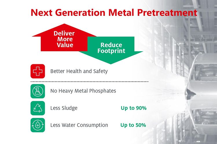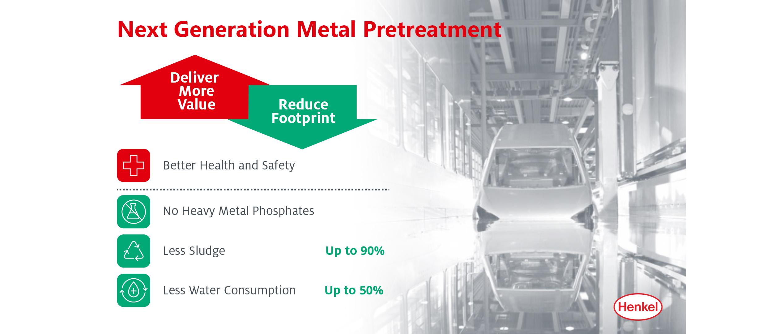 Metal pretreatment is an essential part of vehicle production, as it enables paint adhesion to the vehicle body, while preventing corrosion. Henkel’s next generation metal pretreatment process, also referred to by Henkel as the Bonderite® Thin Film Process and PALLUMINA, reduces the manufacturing steps of a conventional metal pretreatment process from seven to four. Key environmental advancements include the elimination of heavy metal phosphates, such as zinc phosphate, nickel phosphate and manganese phosphate, up to a 90 percent reduction in sludge generation, up to a 40 percent reduction in energy and up to a 50 percent reduction in water usage.
