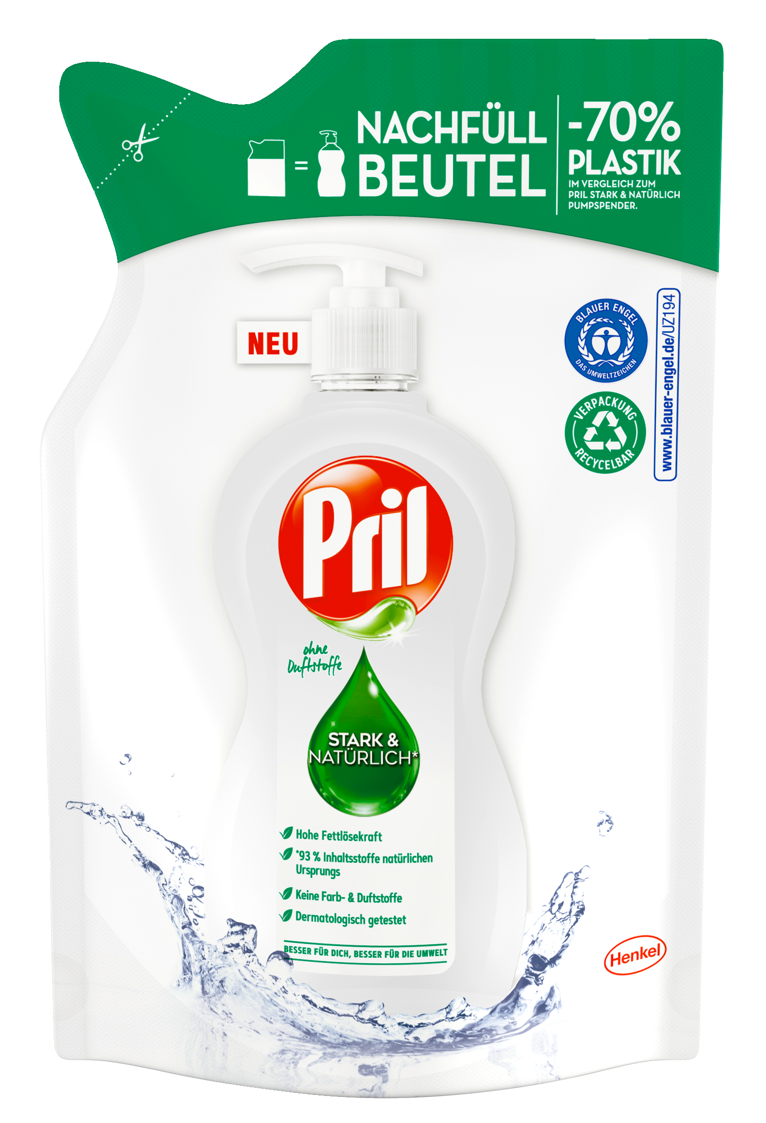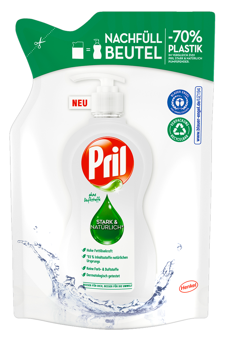 The body of the pump dispenser is made of 100 percent recycled plastic. For a particularly sustainable use of resources, Pril Stark & Natürlich also offers a refill bag for both variants so that the pump dispenser can be refilled again and again. “In this way, consumers save 70 percent plastic when reusing it compared to the Pril Stark & Natürlich pump dispenser. Just like the body of the pump dispenser, the refill bag is also recyclable, because it is made of a polyethylene mono-material,” says Carsten Bertram, Head of Global Packaging Innovation Dishwashing.